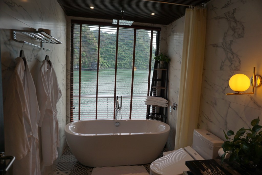 The Stellar of the Seas is a 5555HP luxury ship that is just 7 months old and is currently the most modern and luxurious ship operating on Halong Bay. I was shocked when I learned they had only been doing this for a few months because everything was so well orchestrated. From the first moment I was scooped up, to the last where I was opening a present their sales manager had left for me at my hotel in Hanoi, I felt like royalty (and there were zero hiccups). As our transfer boat approached what would become my home for the next three days I received my first glimpse of the shiny new mega yacht and I felt like a giddy little kid about to walk into Disney World for the first time. I was in awe as I starred at the gorgeous ship floating on the sea green water that was trickled with majestic green islands.