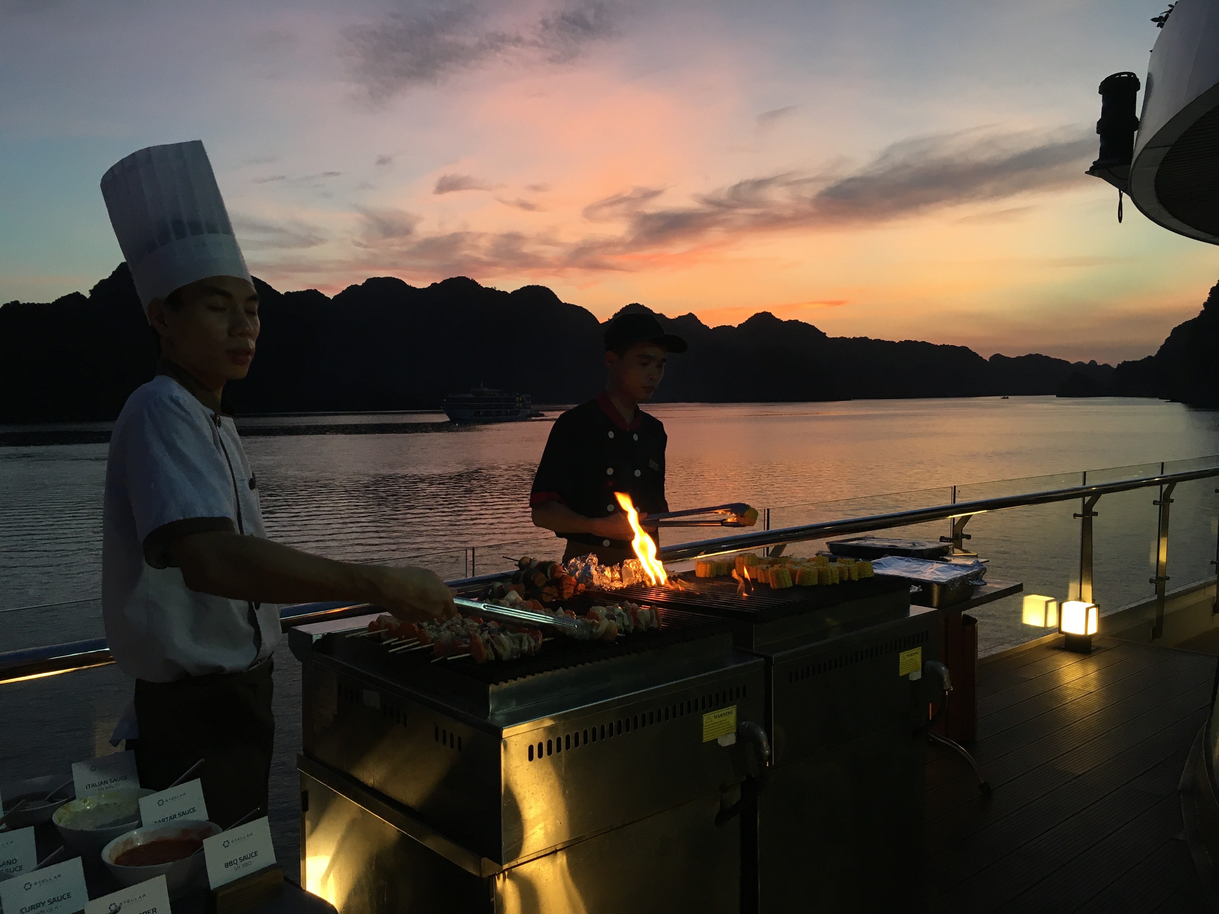 As we stepped onto the ship we were greeted by the staff whom all adorned those genuine and contagious Vietnamese smiles. We were given non-alcoholic welcome drinks and guided to our first of many meals. Our host, Tom, introduced the entire staff and informed us all of their roles. Then we indulged in a five course and five star lunch — and I ordered a beer for lunch as well as a bottle of Australian Sauvignon Blanc to my room. Ironically, Australia became somewhat of a theme for me on this cruise.