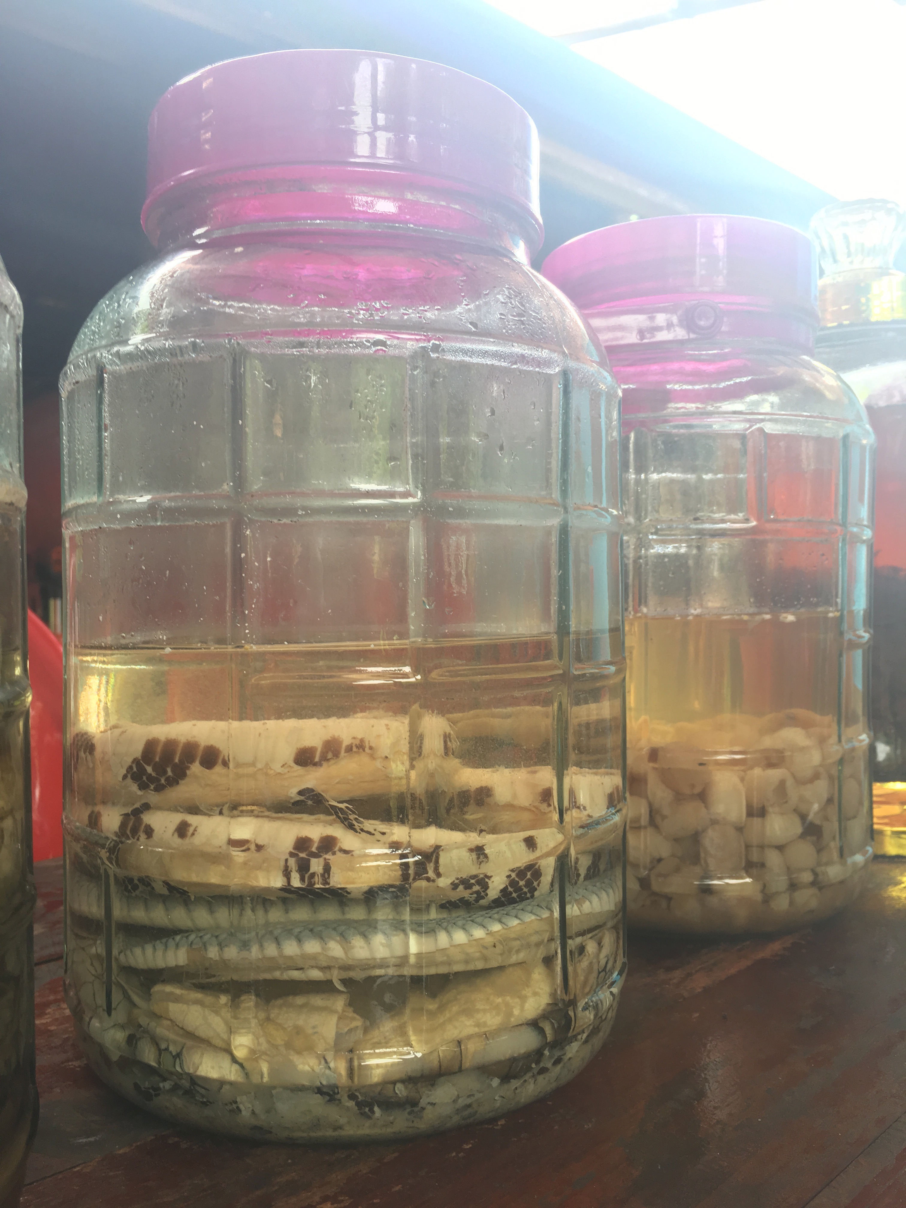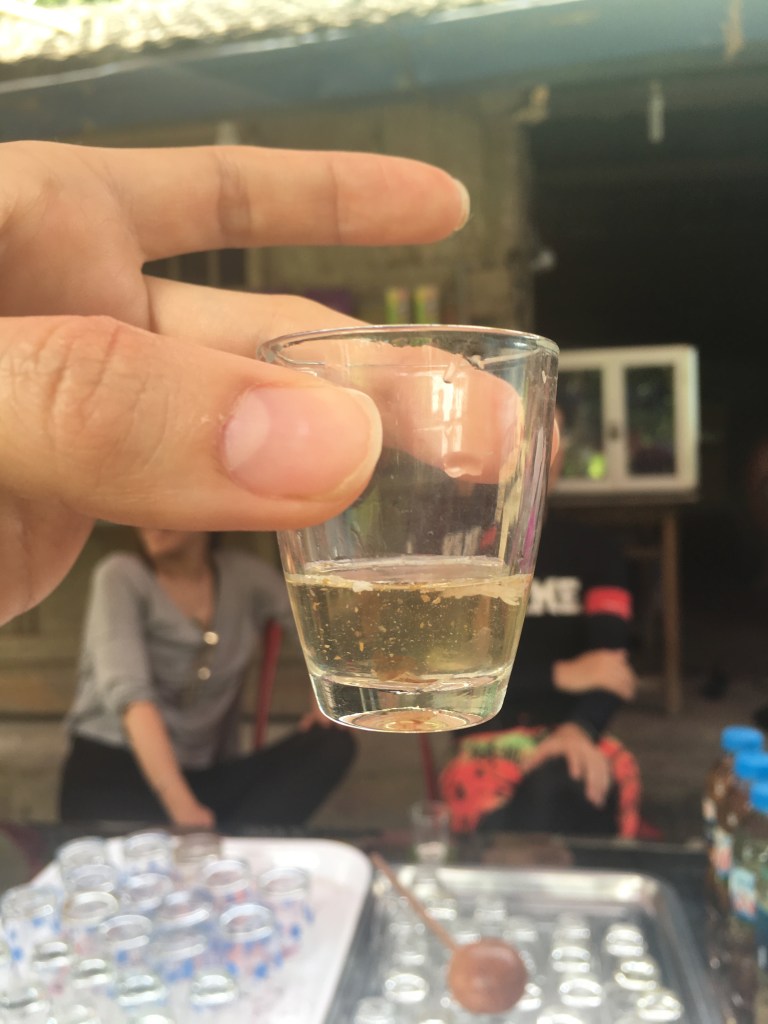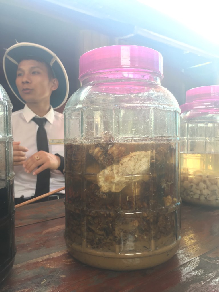 The first one that we tried was called “snake wine” for obvious reasons. Harry started off the snake wine tasting by saying, “don’t worry, we have the clinic and doctor here.” Harry said that there were three types of snakes in this wine that were all found around where we were sitting (and I immediately nervously looked around). One of the snakes was a king cobra, but the other two were not named in English.
